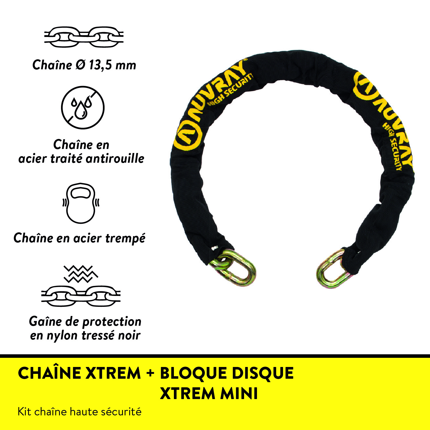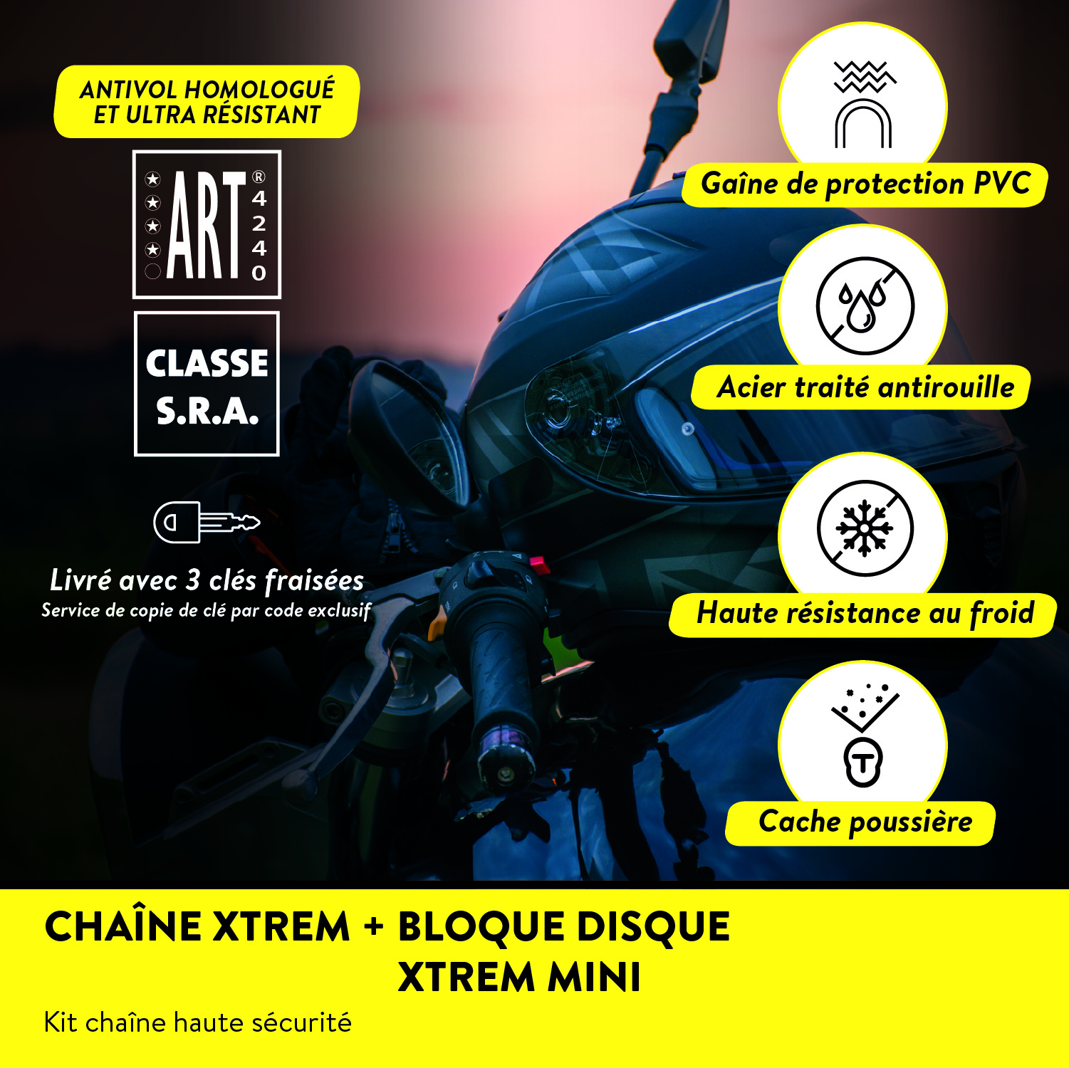Protégez efficacement votre deux-roues avec ce pack complet associant une chaîne en acier cémenté et un bloque-disque haute résistance.