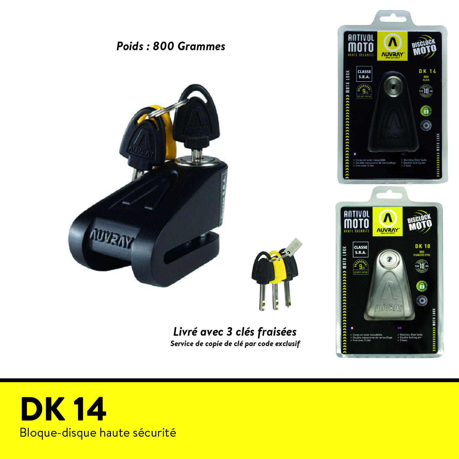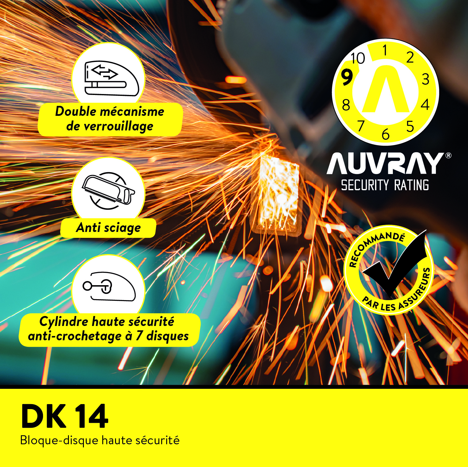 CERTIFICATIONS ET GARANTIE : Les caractéristiques des matériaux et la qualité de fabrication permettent à cet antivol d’être certifié SRA, répondant aux exigences des assurances- Confiant dans la qualité et la durabilité de ses produits, Auvray offre une garantie de 10 ans sur le bloque disque DK 14. Cette garantie témoigne de notre engagement à fournir des produits fiables et durables à nos clients.