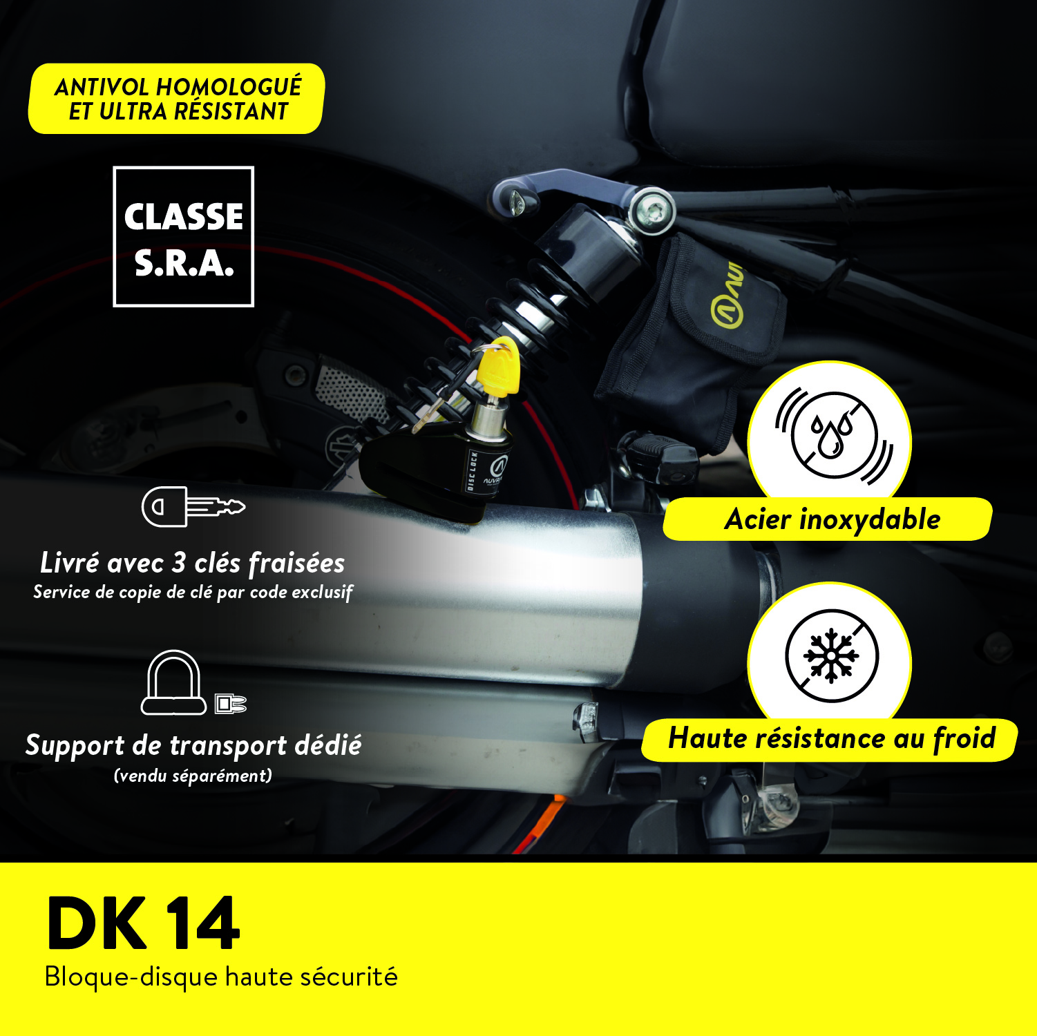 TECHNOLOGIE ANTI-CROCHETAGE ET ANTI-SCIAGE : Équipé d’un cylindre anti-crochetage et d’un mécanisme anti-sciage, le DK 14 offre une défense inébranlable contre les méthodes de vol les plus sophistiquées. Sa broche de 14 mm de diamètre et son double mécanisme de verrouillage augmentent encore la sécurité de votre deux-roues.