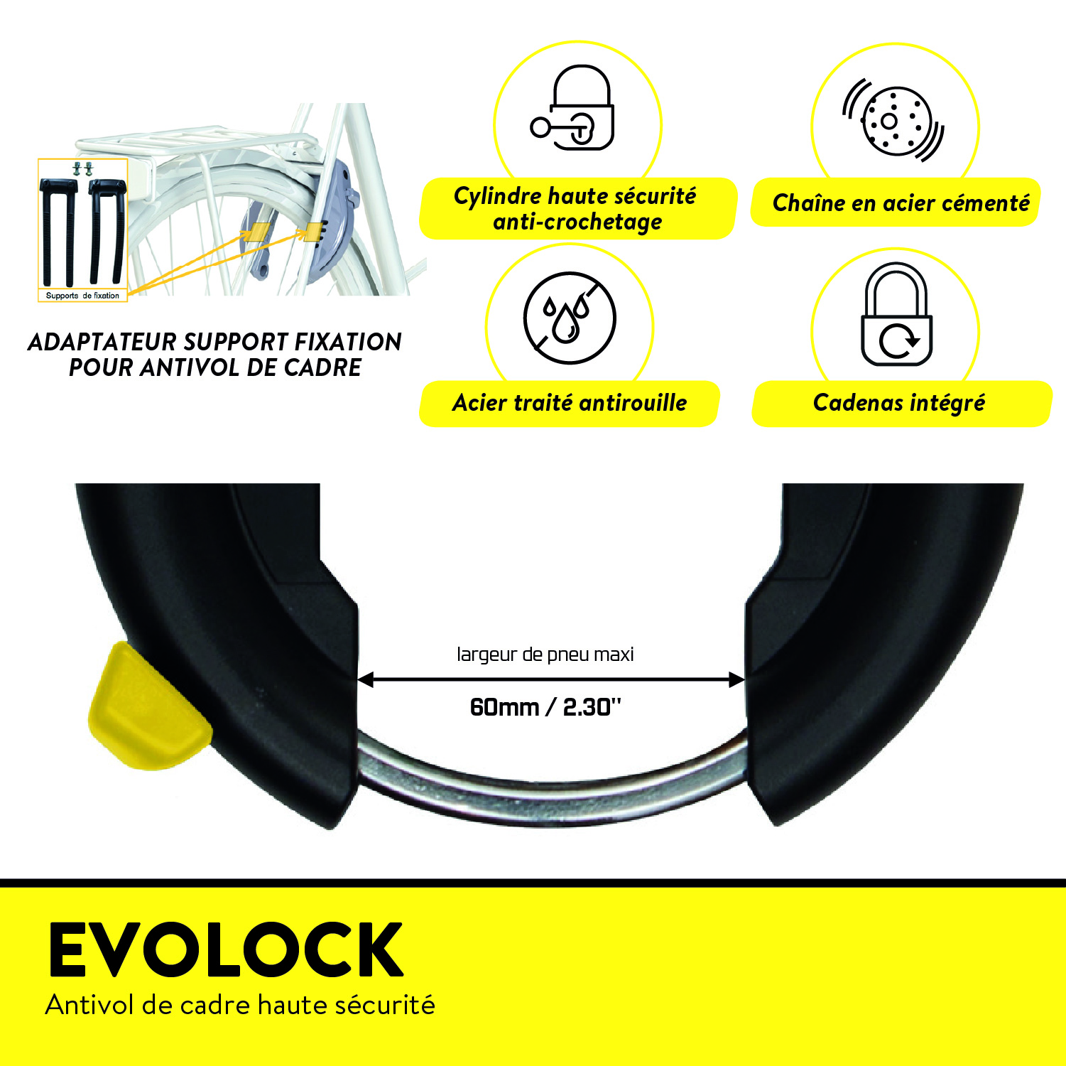 L’antivol de cadre Evolock Auvray, aussi appelé antivol « fer à cheval », se fixe solidement aux haubans du vélo et bloque efficacement la roue arrière. Idéal pour vos arrêts courts en ville, son système simple se verrouille en quelques secondes. Toujours attaché au cadre, il n’encombre pas et vous accompagne dans tous vos trajets
