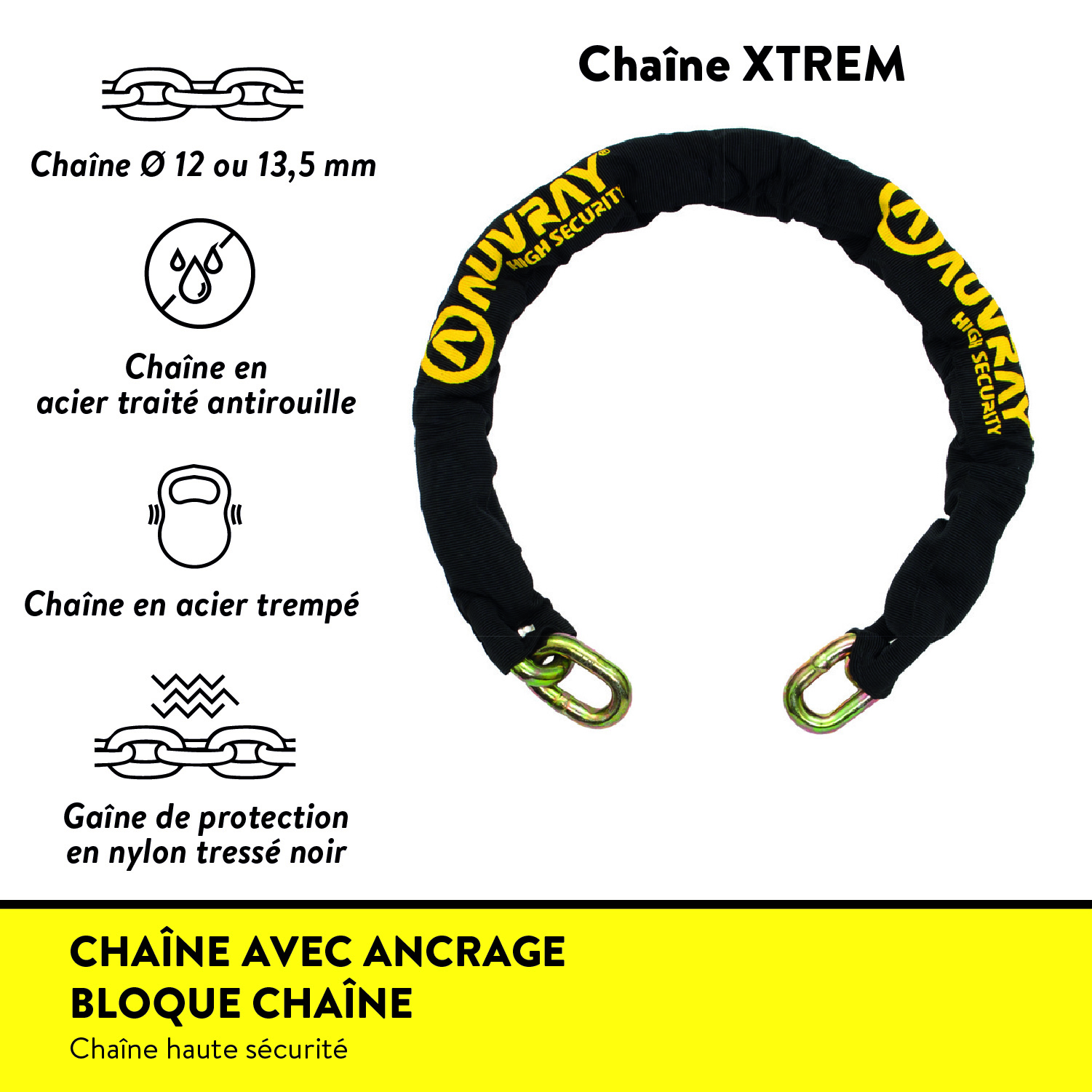 Le Xtrem Protect est conçu pour fonctionner avec une ou deux chaînes Xtrem en configuration classique ou lasso, en 100 ou 120 cm, permettant de sécuriser jusqu’à deux véhicules simultanément (moto + scooter, ou deux vélos par exemple).
